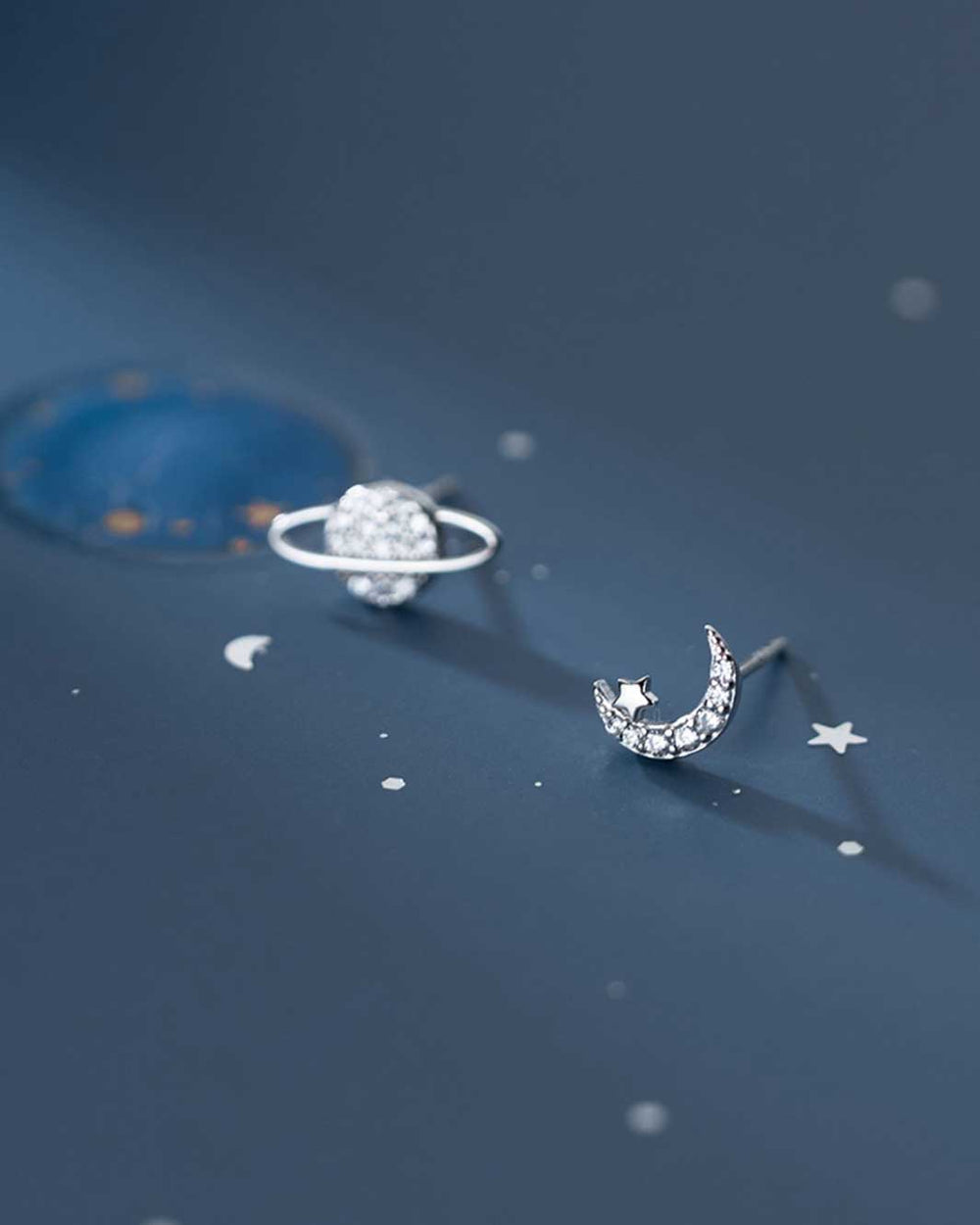 Shine like the cosmos with these fashionable nightsky accessories! Their mis-matched design of a Saturn-shaped planet and Crescent Moon, both adorned with brilliant cubic zirconias, will get you glowing and outta this world!